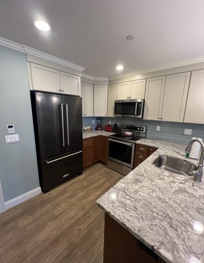 • Full kitchen with French-door-style refrigerator, dishwasher, microwave, and range